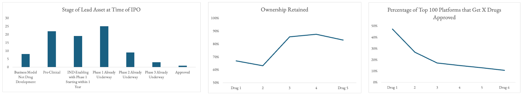 - 50% of the most successful platform biotechs ever ultimately got 1+ drug approved. That means that for 25% of them, it wasn't their lead asset at IPO. To be fair, many companies were pre-clinical, PI or in diagnostics at IPO.