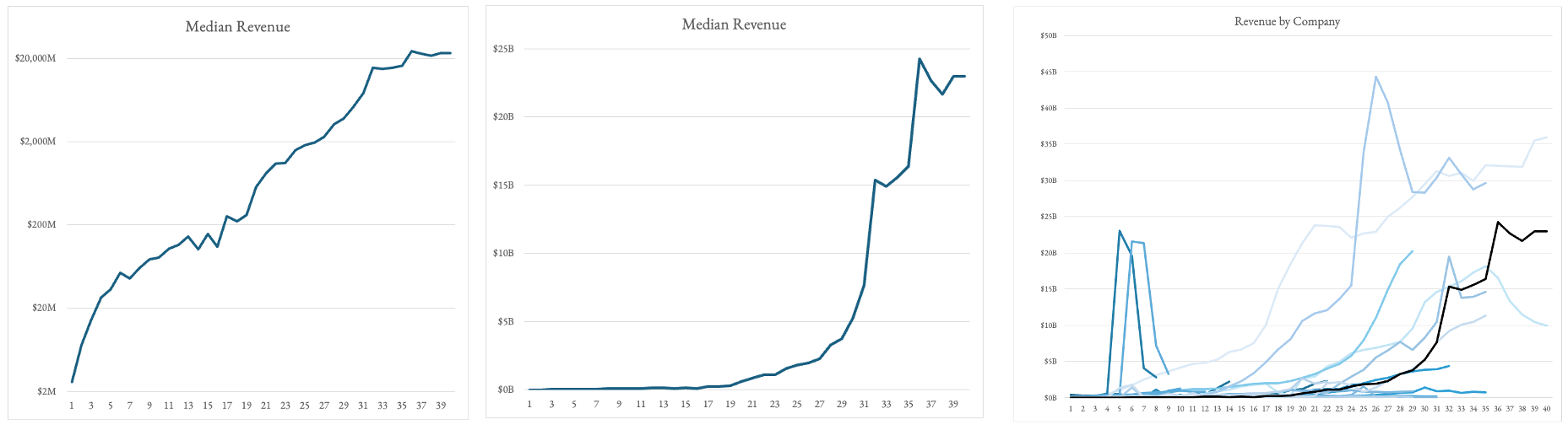 - Revenue plateaus from years ~5-15. The very few companies that make it passed that 10 year lull in sales become the Amgen's of the world.