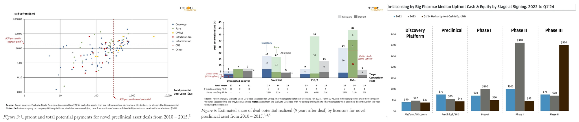 - Preclinical licensors typically capture <20% of the total deal value after nine years. And payouts are heavily power lawed with the majority of dollars going to milestones for Phase III readouts, blockbuster status, or top 10 deals. Deals on novel or unspecified targets delivered only 5-7% of potential, while those for targets already being pursued by others in trials secured 20-40%.