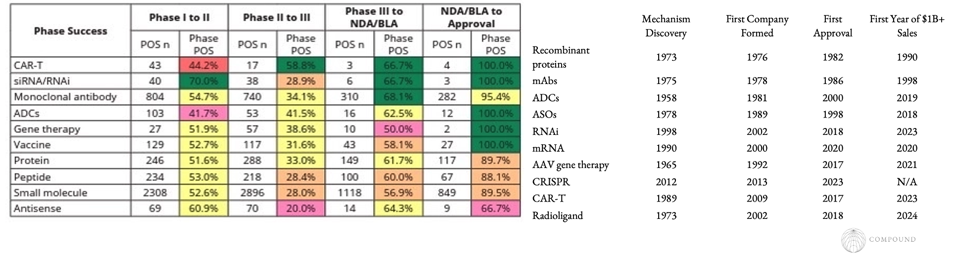 - We at Compound expect that historical timeline to shrink meaningfully over time. Still, during that multi-decade slog, even the companies that now define their modalities regularly experienced existential doubt. It takes a certain kind of leader and culture to persevere.